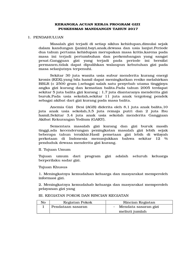 Kerangka Acuan Orientasi Karyawan Baru Gizi Bsh from imgv2-1-f.scribdassets.com Maksud dan tujuan disusunnya kerangka acuan kerja ini adalah sebagai acuan dalam pelaksanaan perencanaan dan pengganggaran program dan kegiatan lingkup dinas ketahanan. Salah satu daur kehidupan yang akan dilalui oleh setiap manusia adalah lanjut usia (lansia). Kerangka acuan pengelolaan pemantauan pertumbuhan balita puskesmas mancak i. Inilah contoh contoh kerangka acuan program gizi kesehatan masyarakat dan hal lain yang berhubungan erat dengan contoh contoh kerangka acuan program gizi kesehatan masyarakat serta aspek k3 secara umum di indonesia. Kerangka acuan kerja program gizi tahun 2017 i. Pendahuluan pemantauan pertumbuhan merupakan salah satu kegiatan utama program perbaikan gizi, yang menitikbreatkan pada upaya pencegahan dan peningkatan keadaan giziz anak. Latar belakang dasar hukum 1. Contoh referensi kerangka acuan program gizi (kak) berikut adalah sedikit referensi tentang membuat kerangka acuan program gizi, masih harus disempurnakan namun bisa jadi referensi tambahan bagi anda yang membutuhkan.