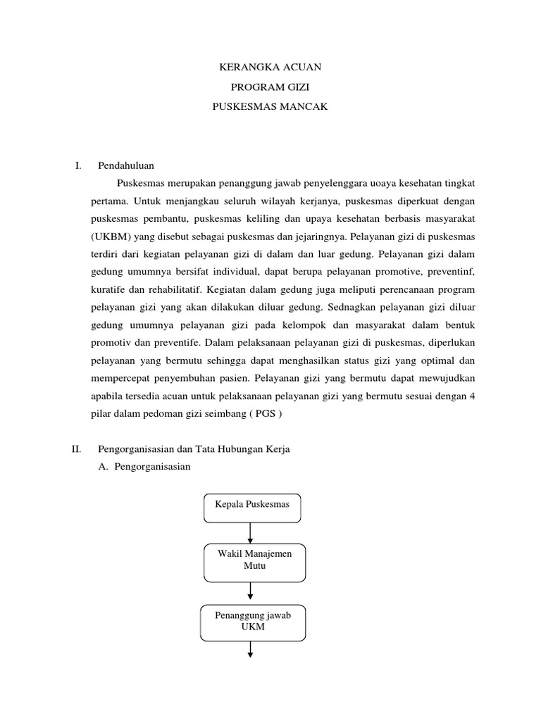 Contoh Kerangka Acuan Kerja Pengadaan Pakaian Dinas ... from 0.academia-photos.com Upaya memperbaiki gizi, makanan, dietetik pada masyarakat, kelompok, individu atau klien yang merupakan suatu rangkaian kegiatan yang meliputi pengumpulan, analisis, simpulan. Konseling gizi adalah kegiatan konsultasi gizi dengan pasien puskesmas yang mempunyai masalah gizi untuk memecahkan masalah gizi yang ada. Salah satu pelayanan di rumah sakit yang tidak kalah penting dari pelayanan rumah sakit yang lain adalah pelayanan gizi. Topik k3 lainnya yang bisa anda pelajari adalah contoh komunikasi vertikal, contoh buku laporan harian satpam, prosedur k3 yang berlaku di industri, tugas 3. Inilah contoh kerangka acuan kerja konselor ahli gizi dan hal lain yang berhubungan erat dengan contoh kerangka acuan kerja konselor ahli gizi serta aspek k3 secara umum di indonesia. Pendahuluan program perbaikan gizi masyarakat telah berjalan puluhan tahun, namun permasalahan gizi masih cukup kompleks dan terjadi di setiap siklus kehidupan, sejak kandungan (janin) hingga usia lanjut. Kerangka acuan kerja program gizi tahun 2017 i. Pendahuluan program pembangunan kesehatan di indonesia dewasa ini masih diprioritaskan pada upaya peningkatan derajat kesehatan ibu dan anak, terutama pada kelompok yang paling rentan kesehatan yaitu ibu hamil, bersalin dan bayi pada.