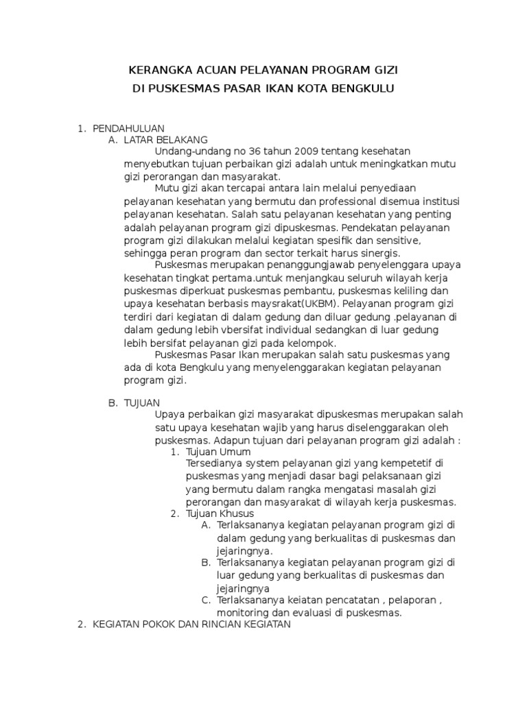 Contoh Kerangka Acuan Program Gizi - Kerangka Acuan Kerja Program Gizi - 70 org x 1p √ 70 orang petugas mengikuti. Pendahuluan program perbaikan gizi masyarakat telah berjalan puluhan tahun, namun permasalahan gizi masih cukup kompleks dan terjadi di setiap siklus kehidupan, sejak kandungan (janin) hingga usia lanjut. Dalam rangka mencapai tujuan program gizi yaitu meningkatkan kesadaran gizi keluarga dalam upaya meningkatkan status gizi masyarakat. Pendahuluan stunting adalah kondisi gagal tumbuh pada anak usia di bawah lima tahun (balita) akibat kekurangan gizi kronis, infeksi berulang, dan stimulasi psikososial yang tidak memadai terutama Konseling gizi adalah kegiatan konsultasi gizi dengan pasien puskesmas yang mempunyai masalah gizi untuk memecahkan masalah gizi yang ada. Pendahuluan program inovasi adalah setiap ide atau pun gagasan baru yang belum pernah ada sebelumnya di puskesmas kampung baru.