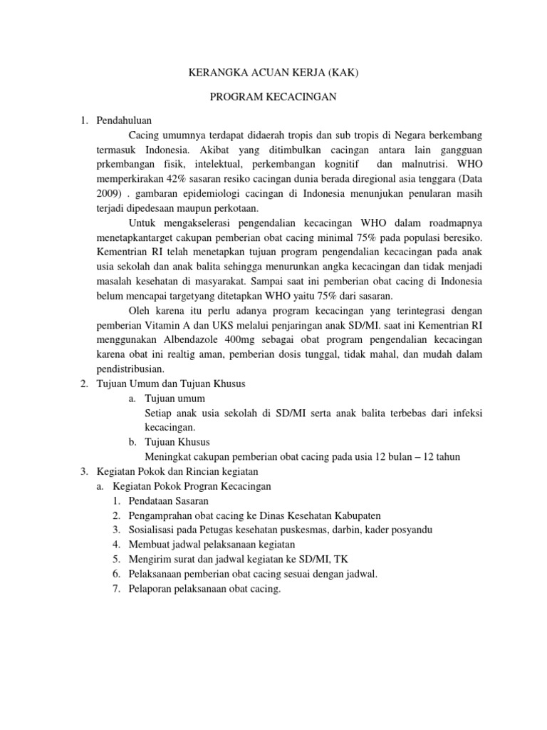 Latar belakang dasar hukum 1. Contoh kerangka acuan kerja konselor ahli gizi. Inilah contoh kerangka acuan kerja konselor ahli gizi dan hal lain yang berhubungan erat dengan contoh kerangka acuan kerja konselor ahli gizi serta aspek k3 secara umum di indonesia. Latar belakang dalam upaya mengatasi masalah gizi pada ibu hamil serta gizi buruk dan gizi kurang pada balita, pemerintah melalui kementerian kesehatan telah menetapkan kebijakan yang komprehensif meliputi Pendahuluan pemantauan pertumbuhan merupakan salah satu kegiatan utama program perbaikan gizi, yang menitikbreatkan pada upaya pencegahan dan peningkatan keadaan giziz anak. Kerangka acuan kegiatan orientasi penanggung jawab dan pelaksana program yang baru puskesmas sukasari jabar pendahuluan puskesmas. Kerangka acuan kerja (kak) program pelayanan administrasi perkantoran kegiatan penyediaan makanan dan minuman. Kerangka acuan kerja program gizi tahun 2017 i. Meningkatkan dan mempertahankan kesehatan fisik, mental dan social ibu dan bayi. Kerangka acuan kegiatan gizi pemberian tablet tambah darah bagi ibu hamil a. Pengelola program kesga dan gizi penyusunan laporan √ 1 dokumen laporan jumlah puskesmas melaksanakan surveilan gizi aktif 15 30 25 3 pelayanan gizi terstandar penyusunan kerangka acuan kegiatan √ dokume kak membentuk tim pelaksana kegiatan √ tim pelaksana kegiatan sosialisasi asuhan gizi lansia : Sumber daya manusia adalah aset yang besar bagi bangsa indonesia jika seluruh warganya telah menjadi manusia indonesia prima antara lain ditandai dengan warganya yang sehat, cerdas dan produktif. Pemetaan status gizi balita sebagai hasil dari bulan penimbangan balita merupakan dasar dan acuan untuk penentuan intervensi dan kebijakan program gizi di tahun selanjutnya.