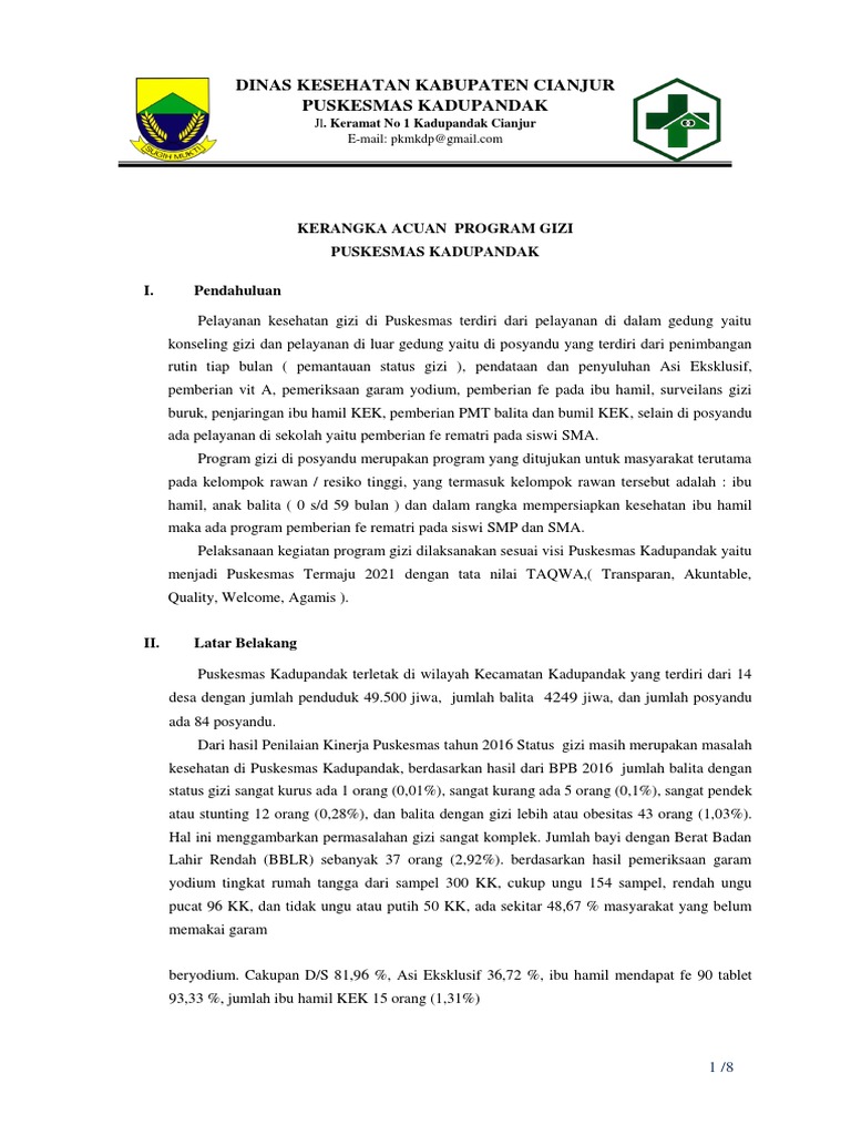 Pendahuluan program inovasi adalah setiap ide atau pun gagasan baru yang belum pernah ada sebelumnya di puskesmas kampung baru. Upaya memperbaiki gizi, makanan, dietetik pada masyarakat, kelompok, individu atau klien yang merupakan suatu rangkaian kegiatan yang meliputi pengumpulan, analisis, simpulan. Kerangka acuan program gizi puskesmas kampar kiri. Maksud dan tujuan disusunnya kerangka acuan kerja ini adalah sebagai acuan dalam pelaksanaan perencanaan dan pengganggaran program dan kegiatan lingkup badan ketahanan pangan serta. Latar belakang kesehatan dan gizi merupakan faktor penting , yang secara langsung berpengaruh terhadap kualitas sumber daya manusia (sdm).sumber daya manuasia yang sehat dan berkualitas merupakan modal utama atau investasi dalam pembangunan kesehatan.