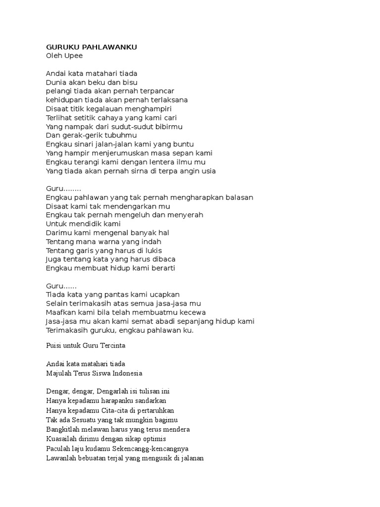 60 Puisi Pendidikan Singkat Berbagai Tema Dosenpintar Com from dosenpintar.com Sepertinya lagu itu begitu tepat dinyanyikan hari ini, 10 november. Bahasa payah ulang pidato kali inggris pidato. Loading the chords for 'guruku pahlawanku'. Ketika saya diminta untuk berbicara tentang guru, maka tak lain yang terbersit di benak saya. Guruku pahlawanku | pada dasarnya, setiap orang di dunia ini menginginkan suatu keberhasilan di dalam menjalani hidupnya. Andai bukan karena guruku, mana mungkin aku mengenal tuhanku. Melihat kondisi tersebut, tentunya beban guru amat berat sehingga profesi ini selayaknya dijalankan oleh seseorang yang dengan tulus mendedikasikan dirinya. Oleh upee andai kata matahari tiada dunia akan beku dan bisu pelangi tiada akan pernah terpancar kehidupan tiada.